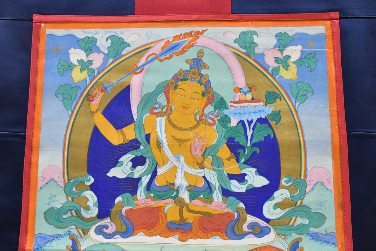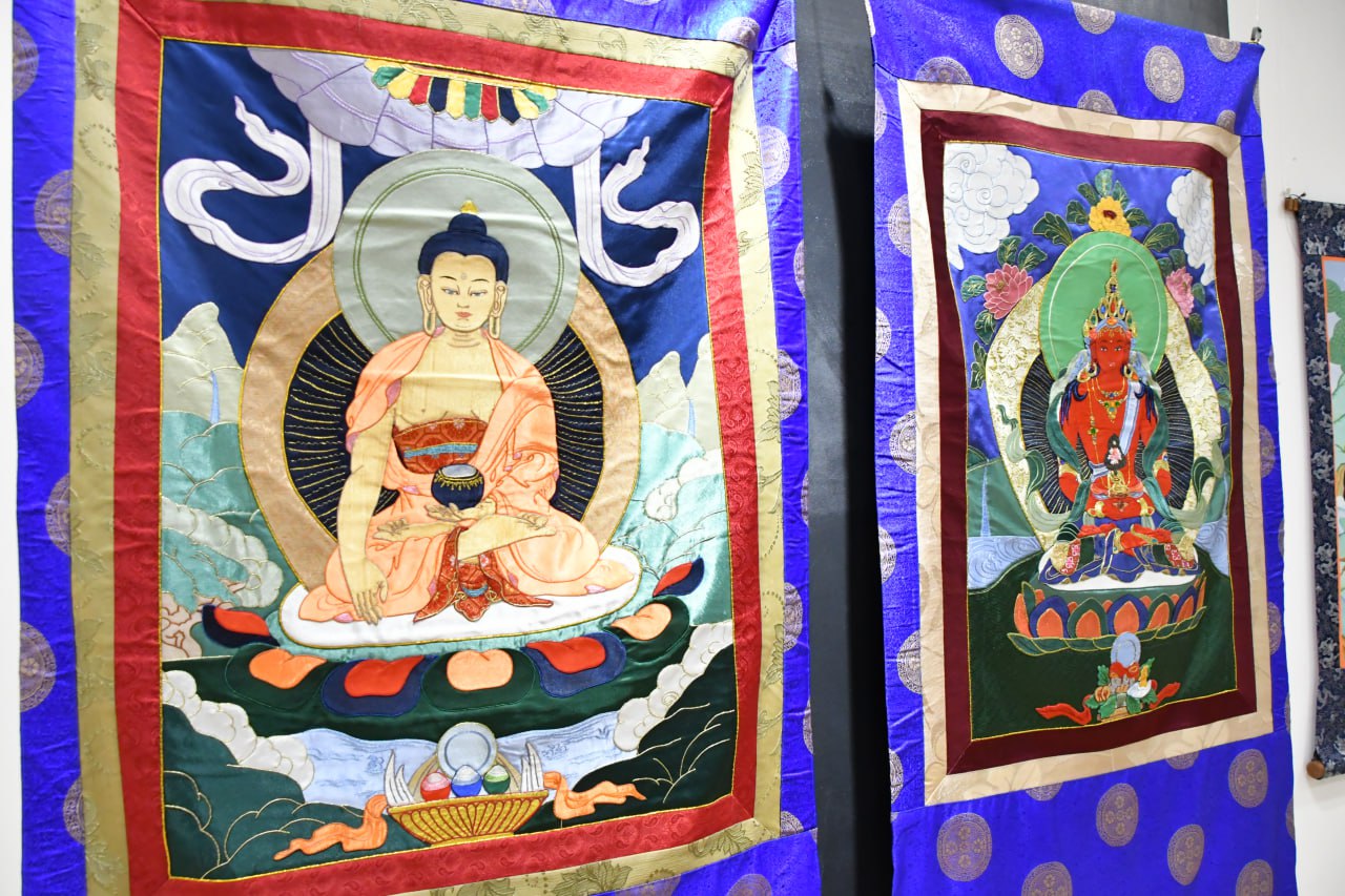 В экспозиции представлены живописные творения, вышивки, аппликации, миниатюры мастера буддийской живописи, искусствоведа Нимацирен Дондоковой, её отца, художника танка Данзана Дондокова, а также его учеников и последователей.