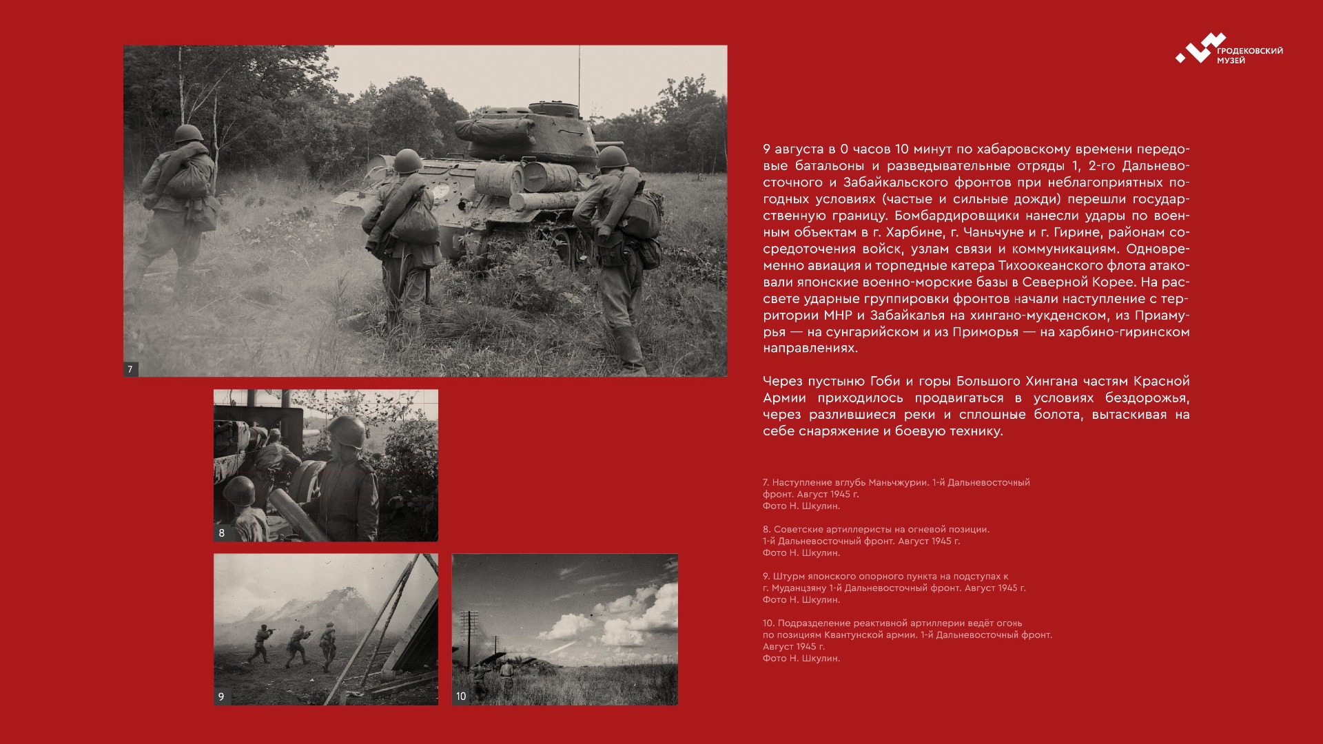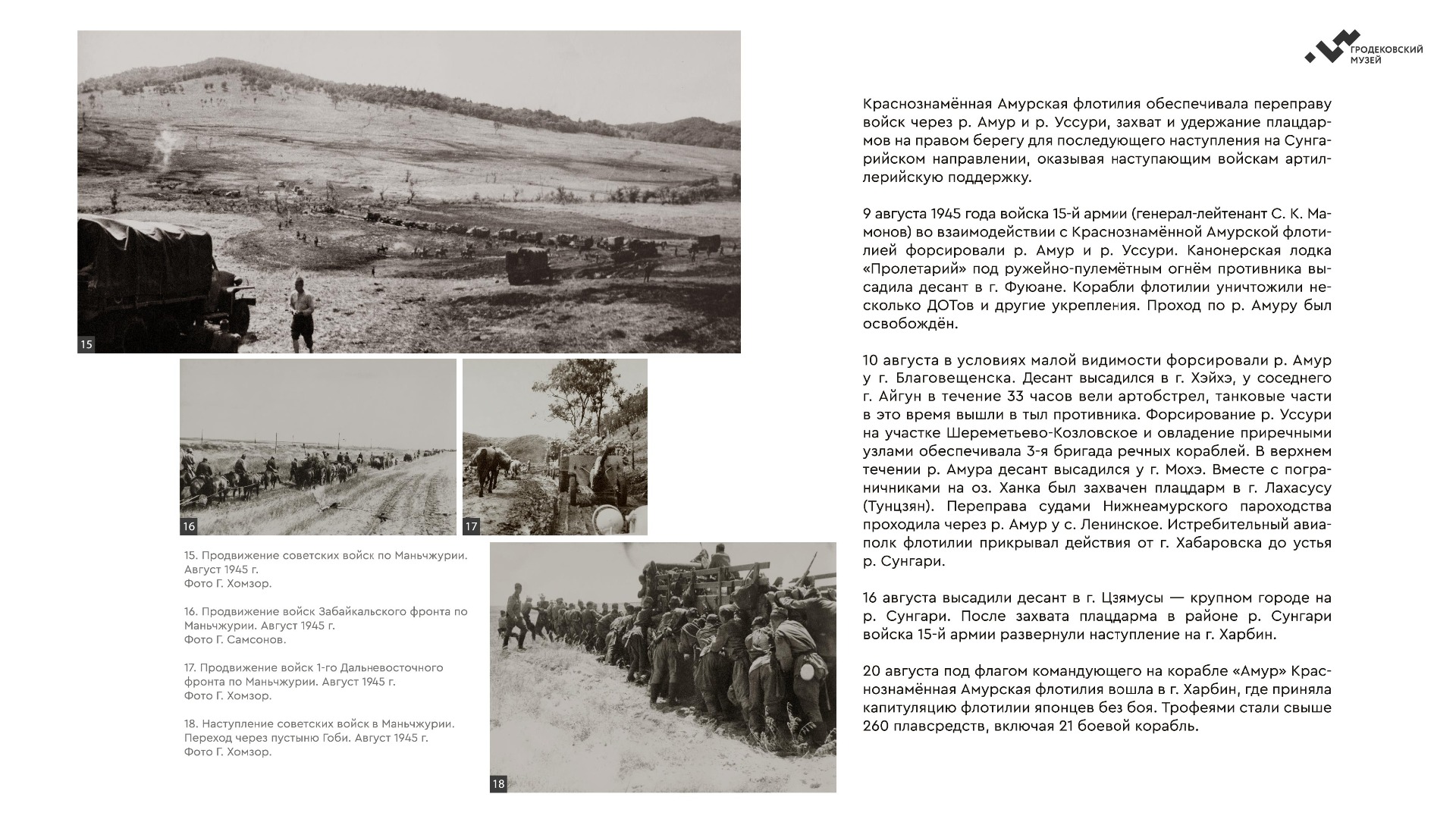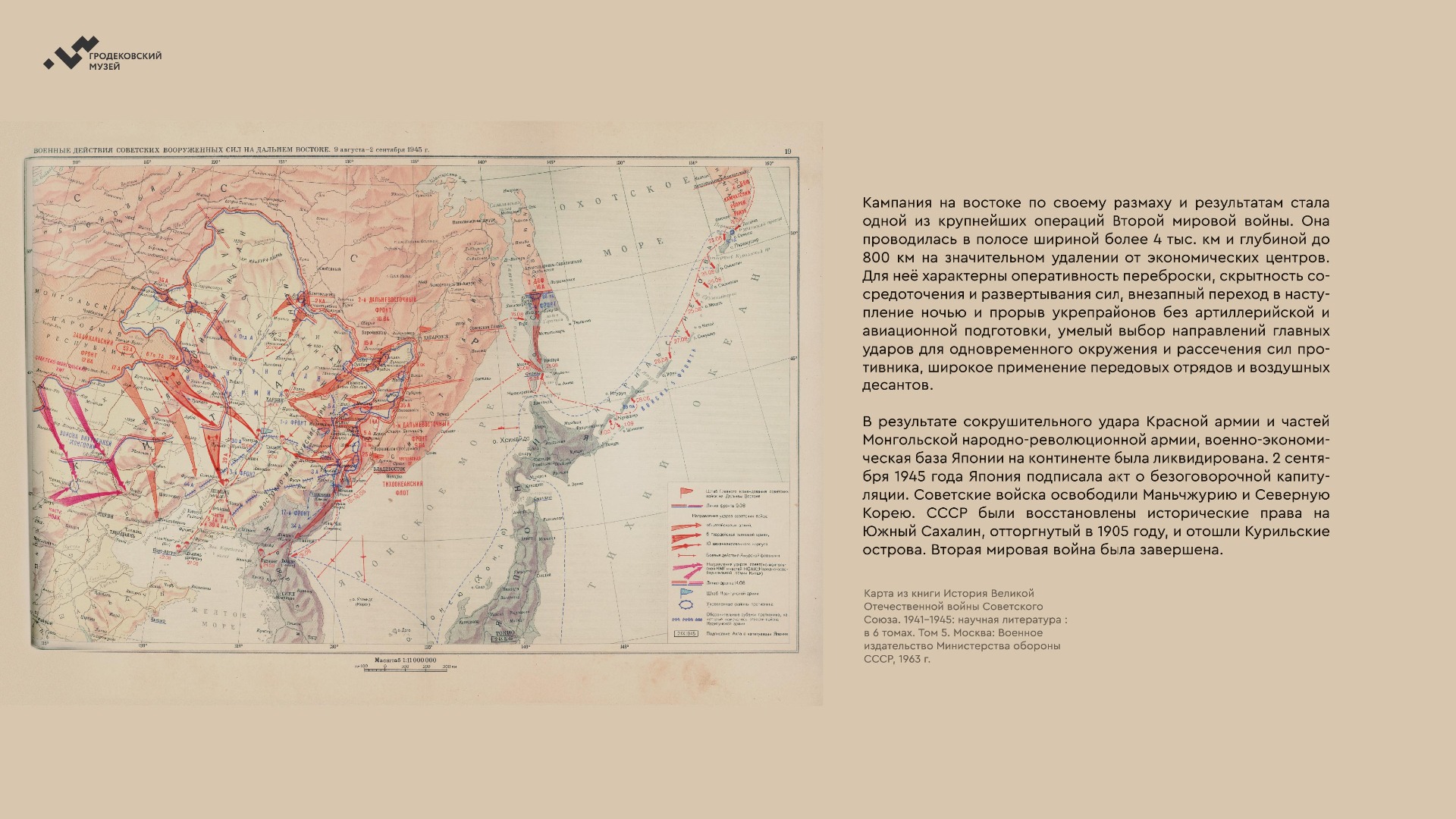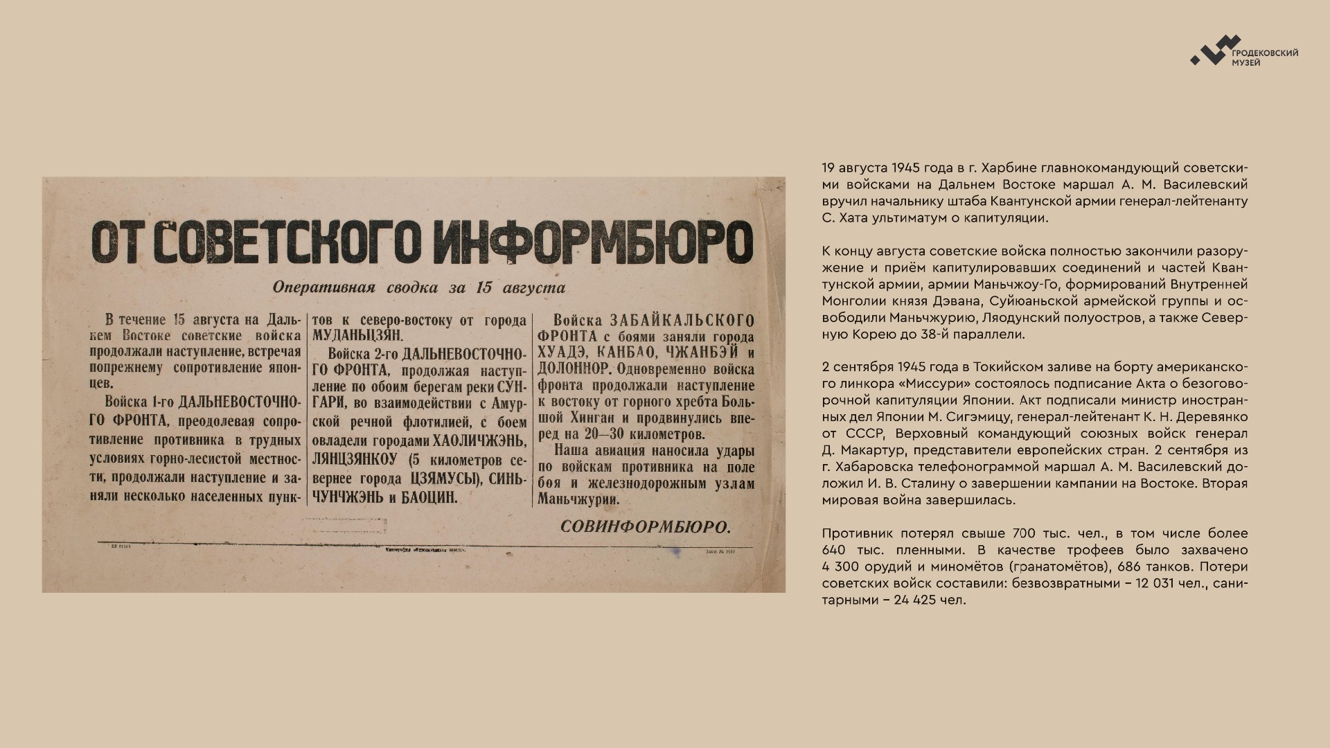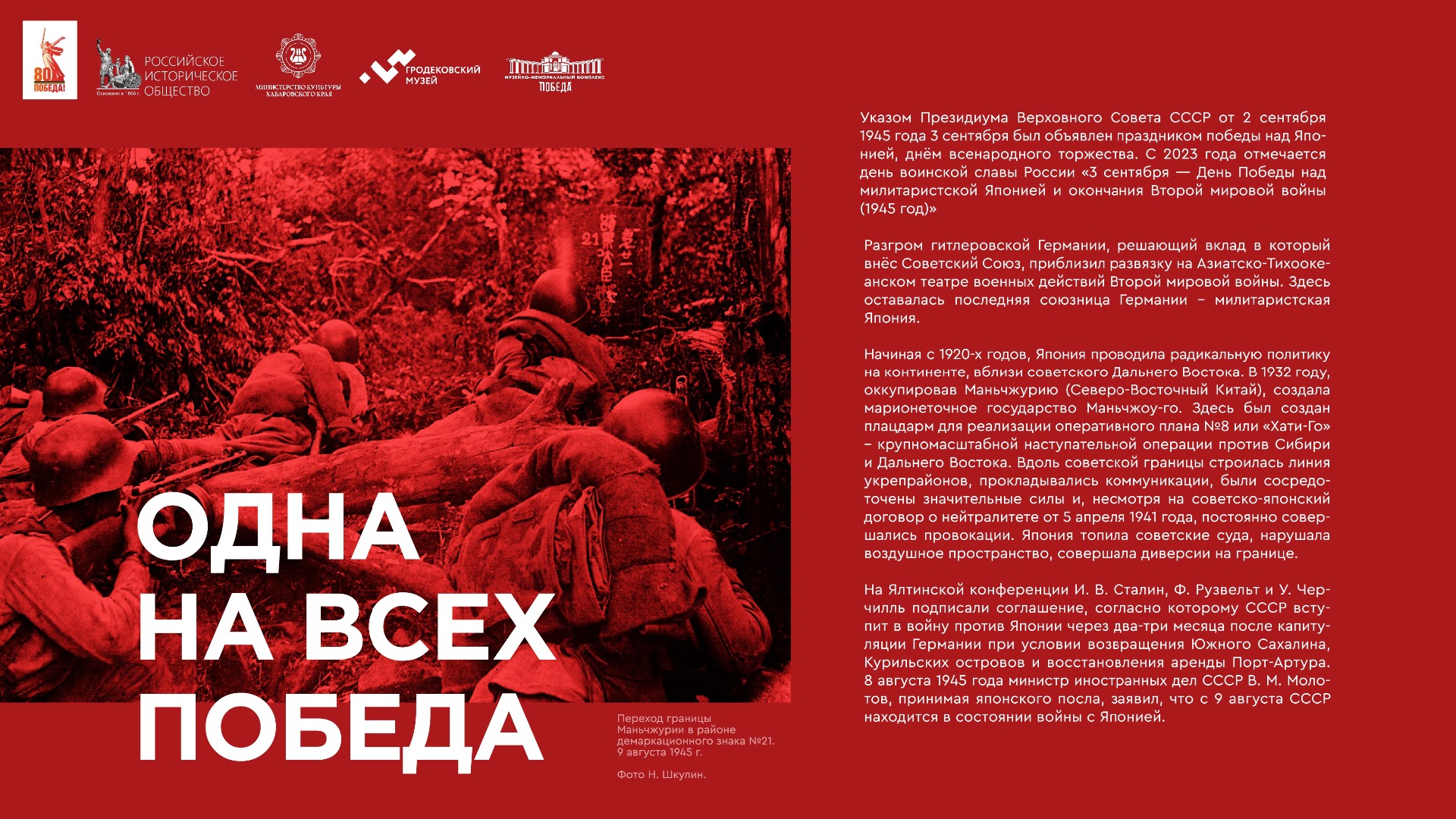 На выставке представлены уникальные фотографии, документы и личные истории ветеранов из коллекции Хабаровского краевого музея имени Н.И. Гродекова, а также из собрания Музейно-мемориального комплекса «Победа» (г. Южно-Сахалинск), которые рассказывают о главных военных операциях августа-сентября 1945 года, в результате которых Вторая мировая война была завершена: Маньчжурской стратегической наступательной, Южно-Сахалинской и Курильской десантной, о героизме участников войны с милитаристской Японией. документы. Виртуальная выставка направлена на сохранение исторической памяти о ключевой роли советского народа, освободившего от нацизма не только народы Европы, но и Азии.