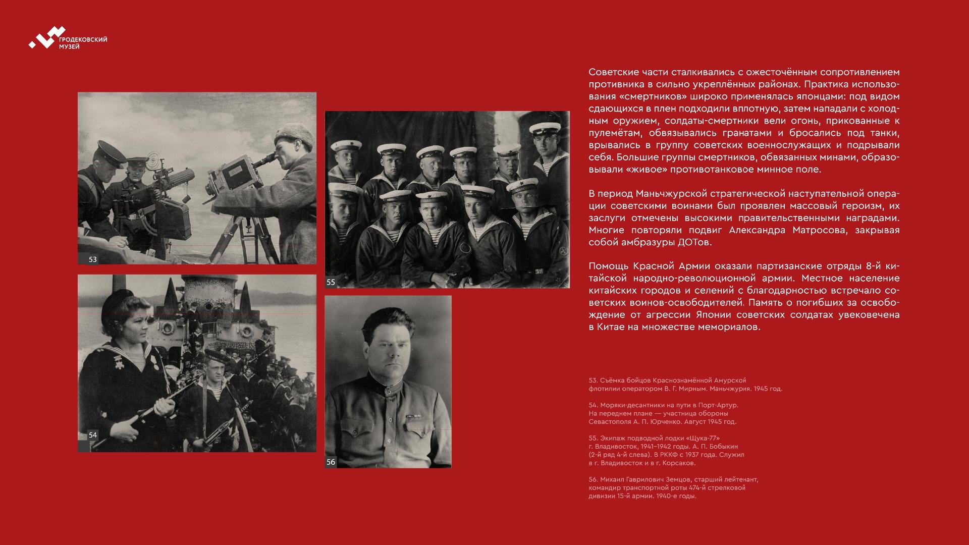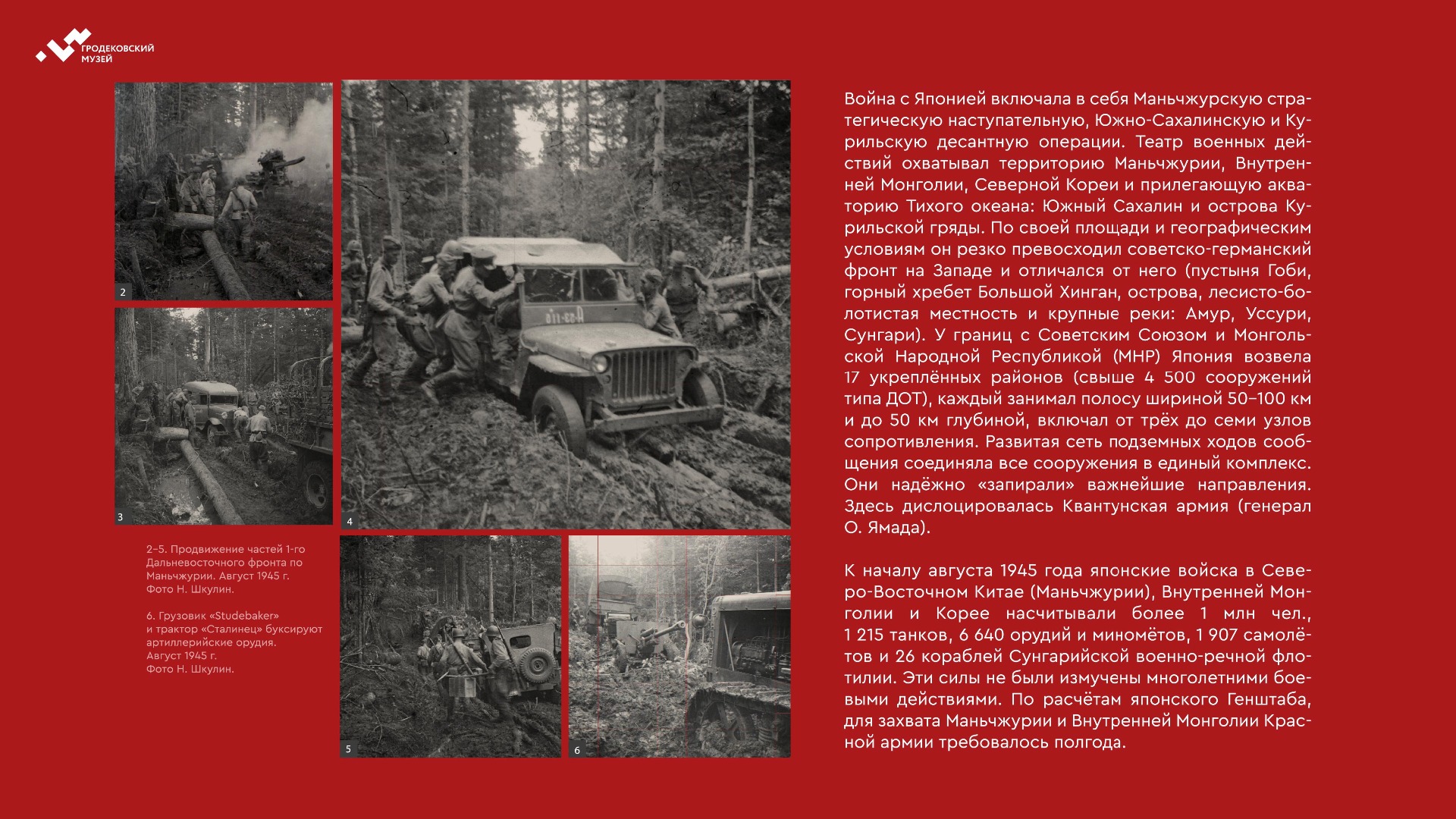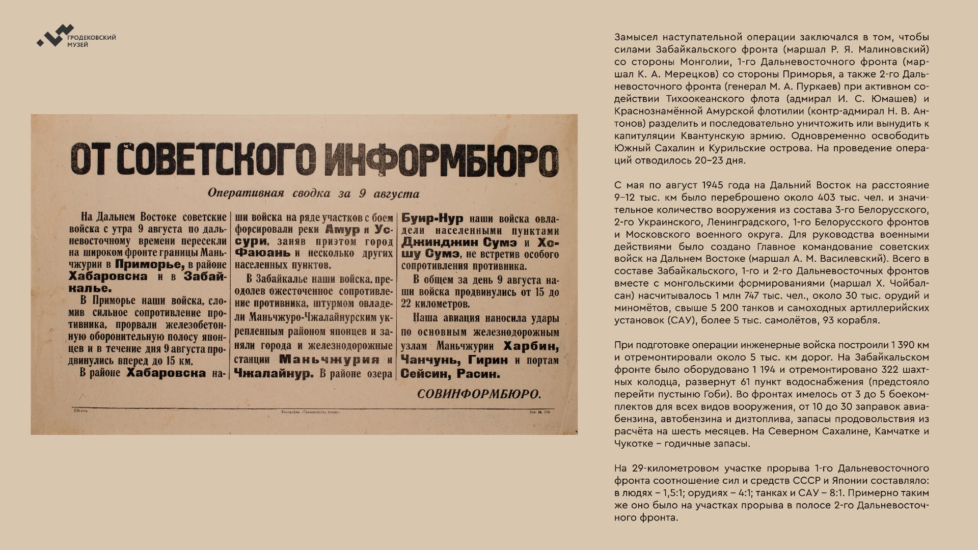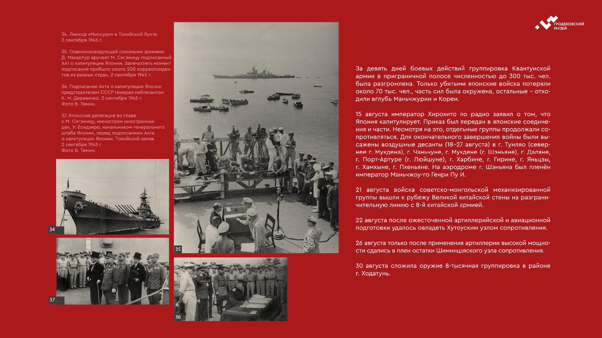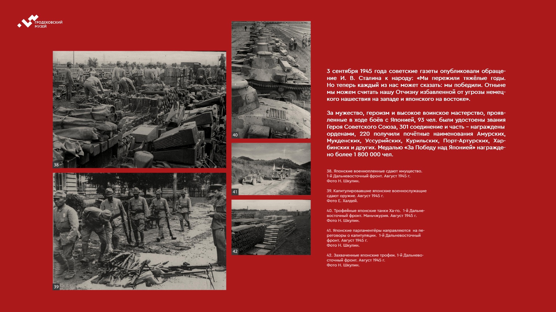 На выставке представлены уникальные фотографии, документы и личные истории ветеранов из коллекции Хабаровского краевого музея имени Н.И. Гродекова, а также из собрания Музейно-мемориального комплекса «Победа» (г. Южно-Сахалинск), которые рассказывают о главных военных операциях августа-сентября 1945 года, в результате которых Вторая мировая война была завершена: Маньчжурской стратегической наступательной, Южно-Сахалинской и Курильской десантной, о героизме участников войны с милитаристской Японией. документы. Виртуальная выставка направлена на сохранение исторической памяти о ключевой роли советского народа, освободившего от нацизма не только народы Европы, но и Азии.