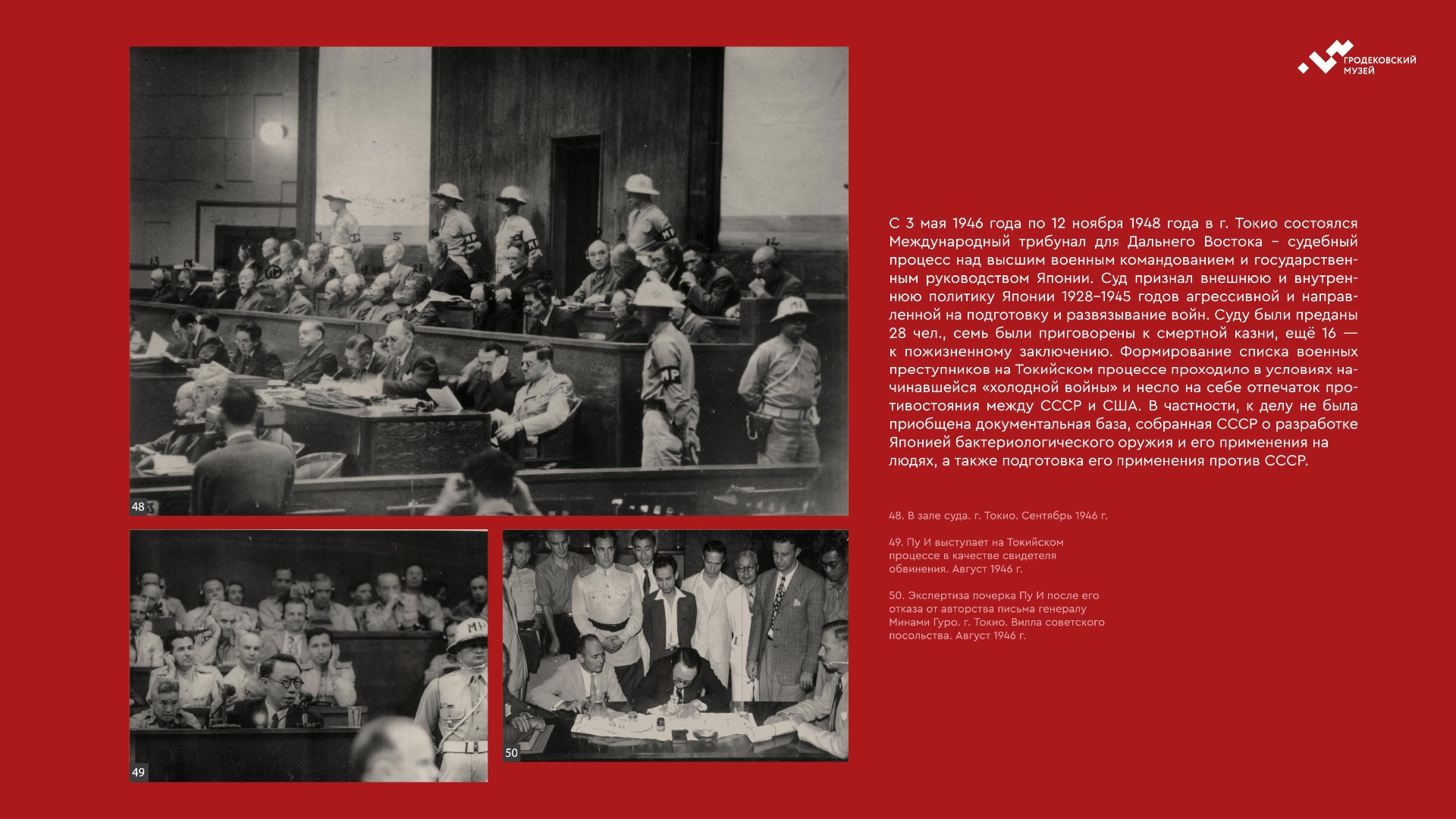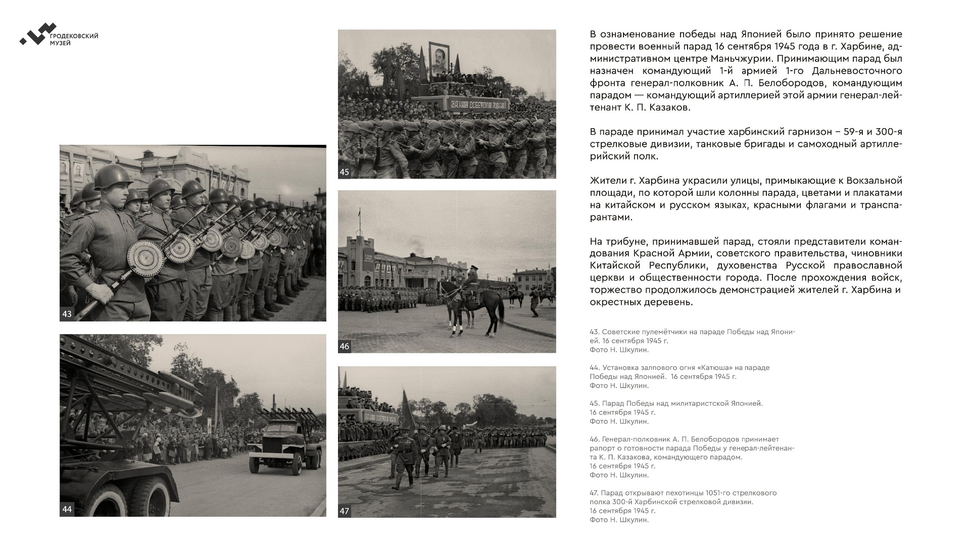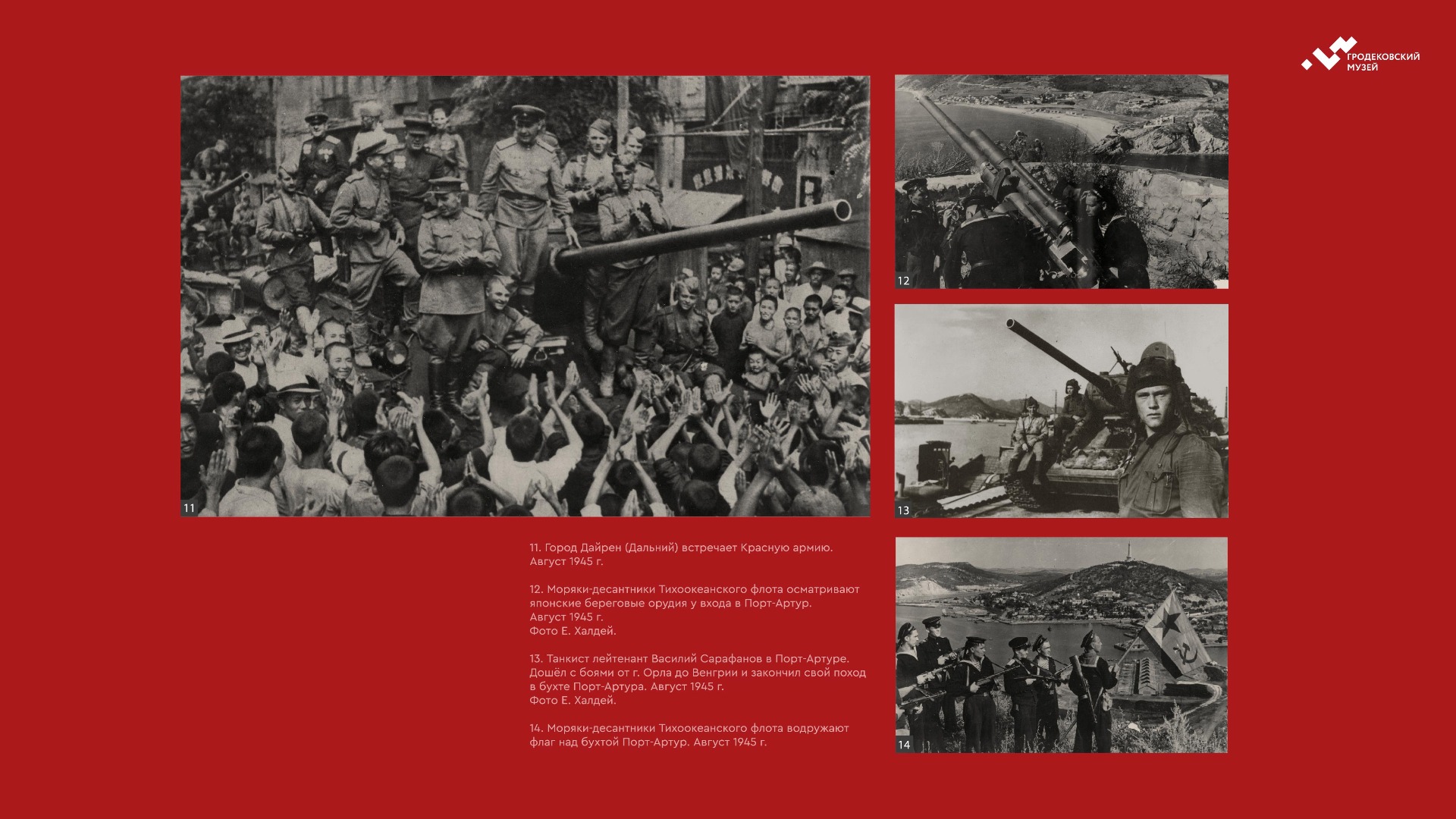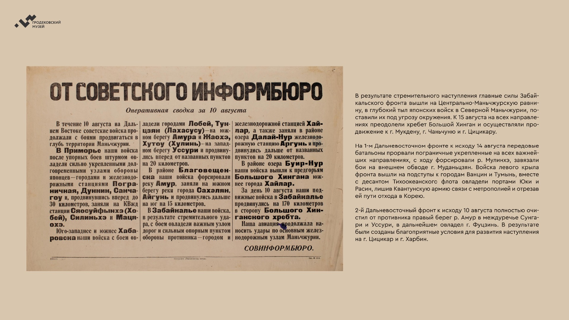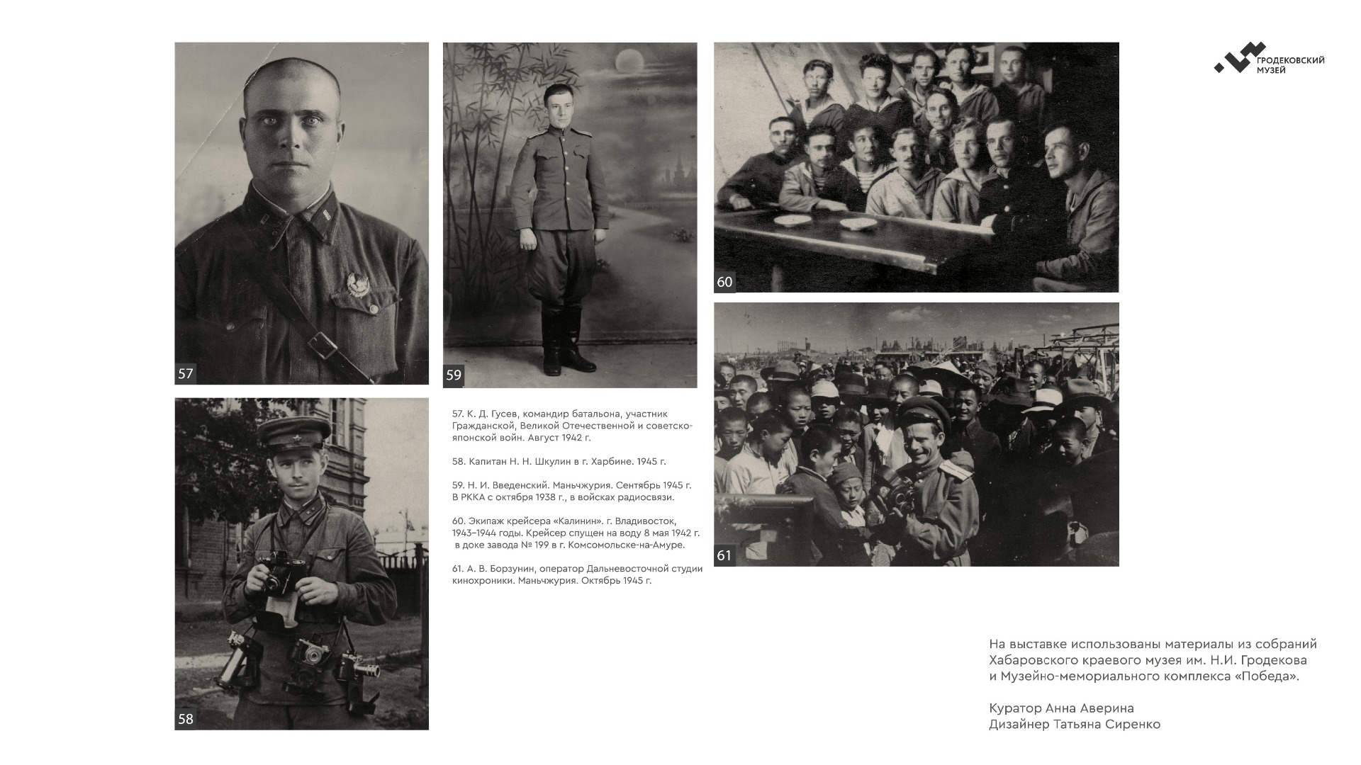 На выставке представлены уникальные фотографии, документы и личные истории ветеранов из коллекции Хабаровского краевого музея имени Н.И. Гродекова, а также из собрания Музейно-мемориального комплекса «Победа» (г. Южно-Сахалинск), которые рассказывают о главных военных операциях августа-сентября 1945 года, в результате которых Вторая мировая война была завершена: Маньчжурской стратегической наступательной, Южно-Сахалинской и Курильской десантной, о героизме участников войны с милитаристской Японией. документы. Виртуальная выставка направлена на сохранение исторической памяти о ключевой роли советского народа, освободившего от нацизма не только народы Европы, но и Азии.