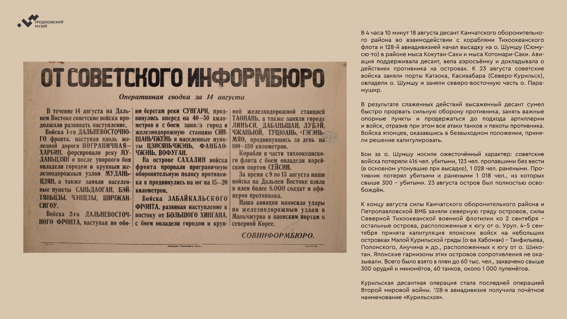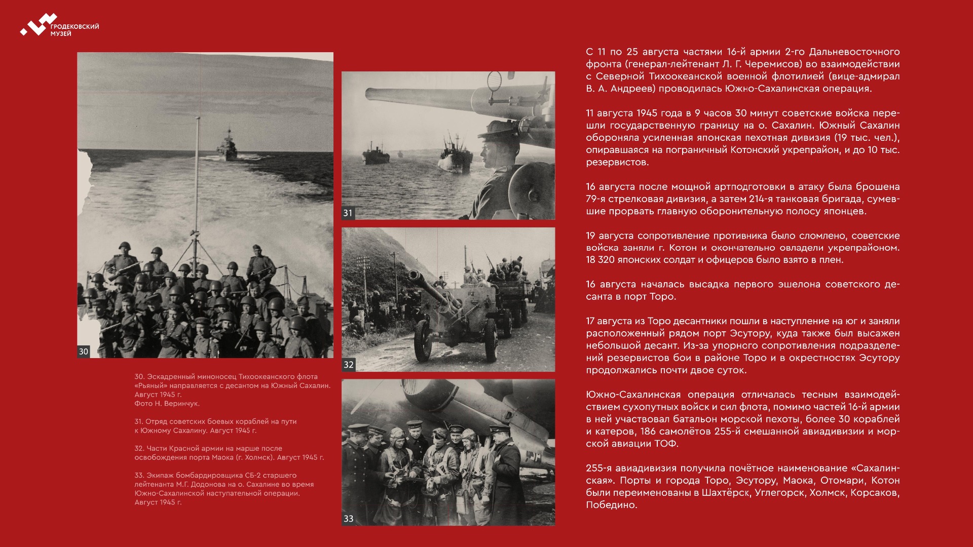 Выставка расскажет о ключевой роли Советского Союза в освобождении народов Европы и Азии, а также о героизме участников Южно-Сахалинской и Курильской десантной операций.