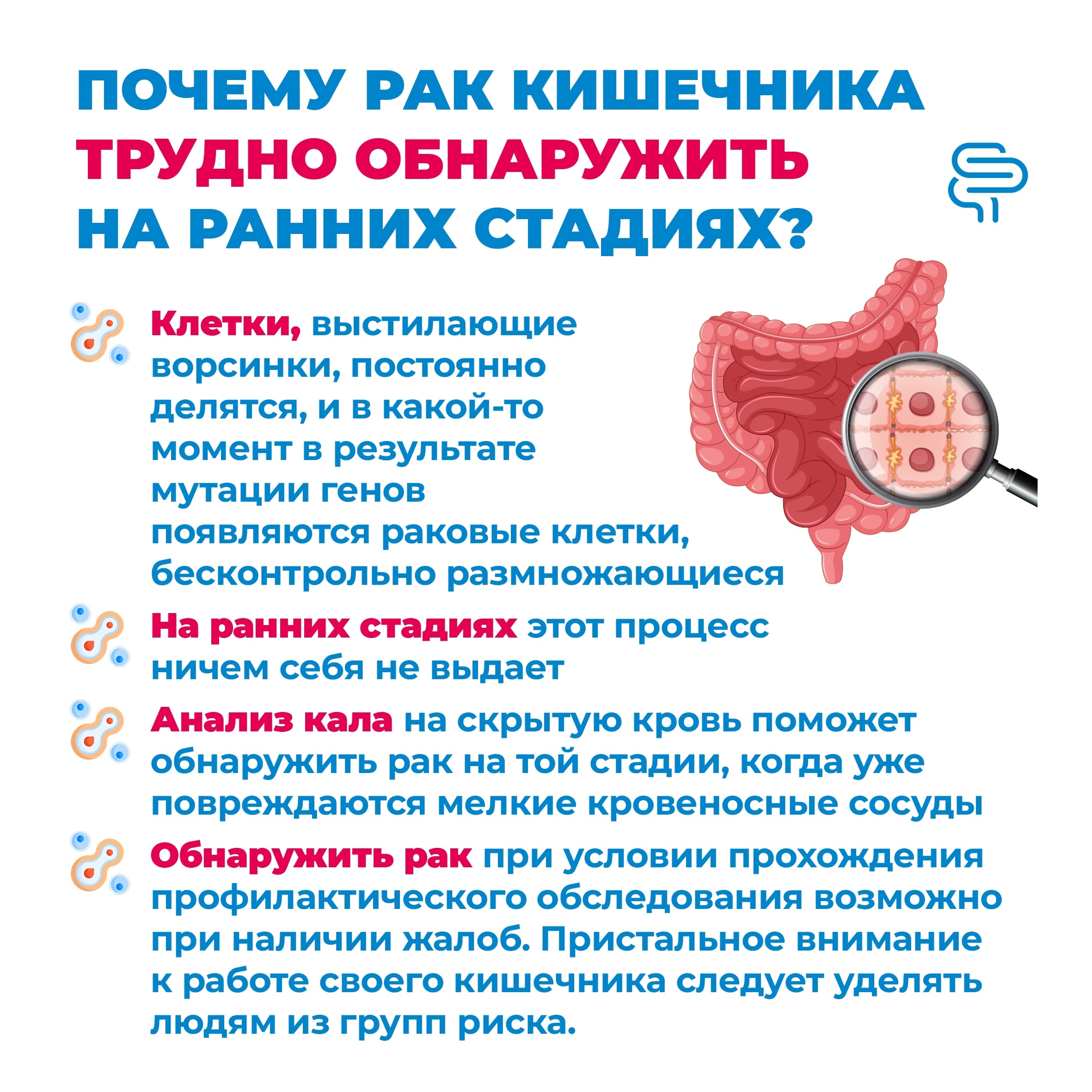 Не ждите тревожных симптомов. Многие онкологические заболевания, включая рак кишечника, долго развиваются незаметно.